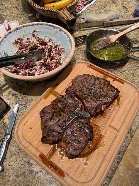 This week I happened to be visiting my mother in law in Florida, which made it the right moment for a dinner that felt slightly celebratory without requiring much effort. We made Grilled Porterhouse Steak with Rosemary and Fennel alongside French Bistro Salad, a pairing that illustrates several of the principles that show up throughout this book.