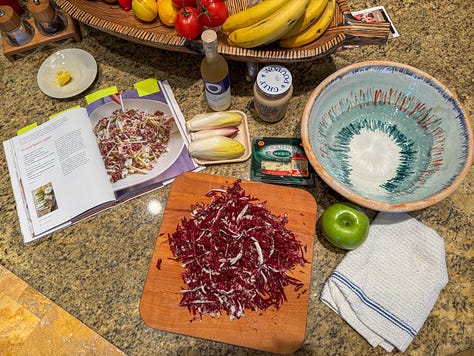 The salad moves in the opposite direction. Radicchio and endive bring bitterness, apples add crisp sweetness, Roquefort contributes richness, and caramelized walnuts provide both texture and a little sugar.