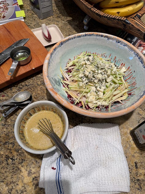 The salad follows the same logic. Nothing about the ingredients is unusual, but the balance between bitter greens, sweet apples, sharp cheese, and crunchy walnuts makes the whole thing feel more interesting than any single element would on its own.